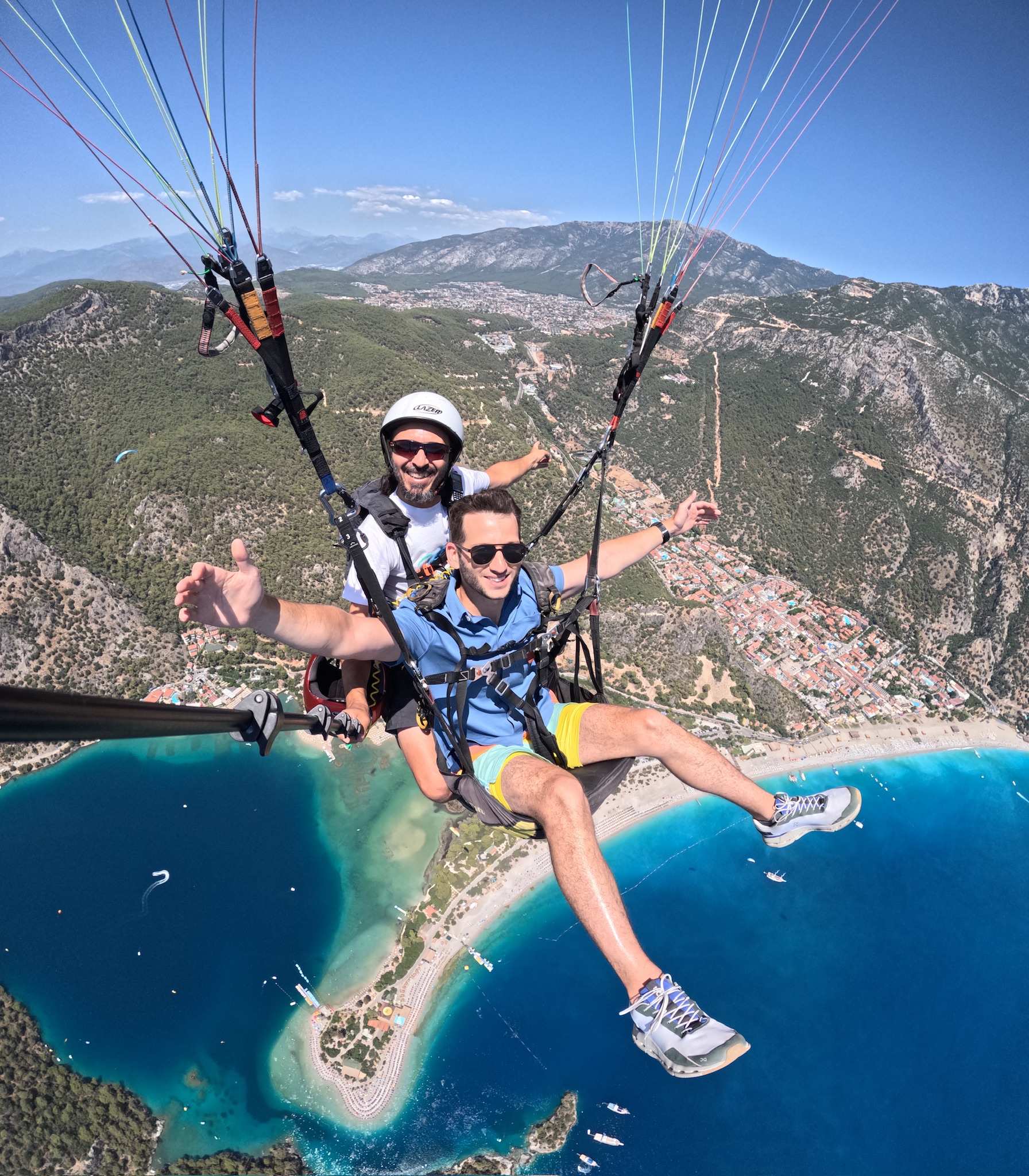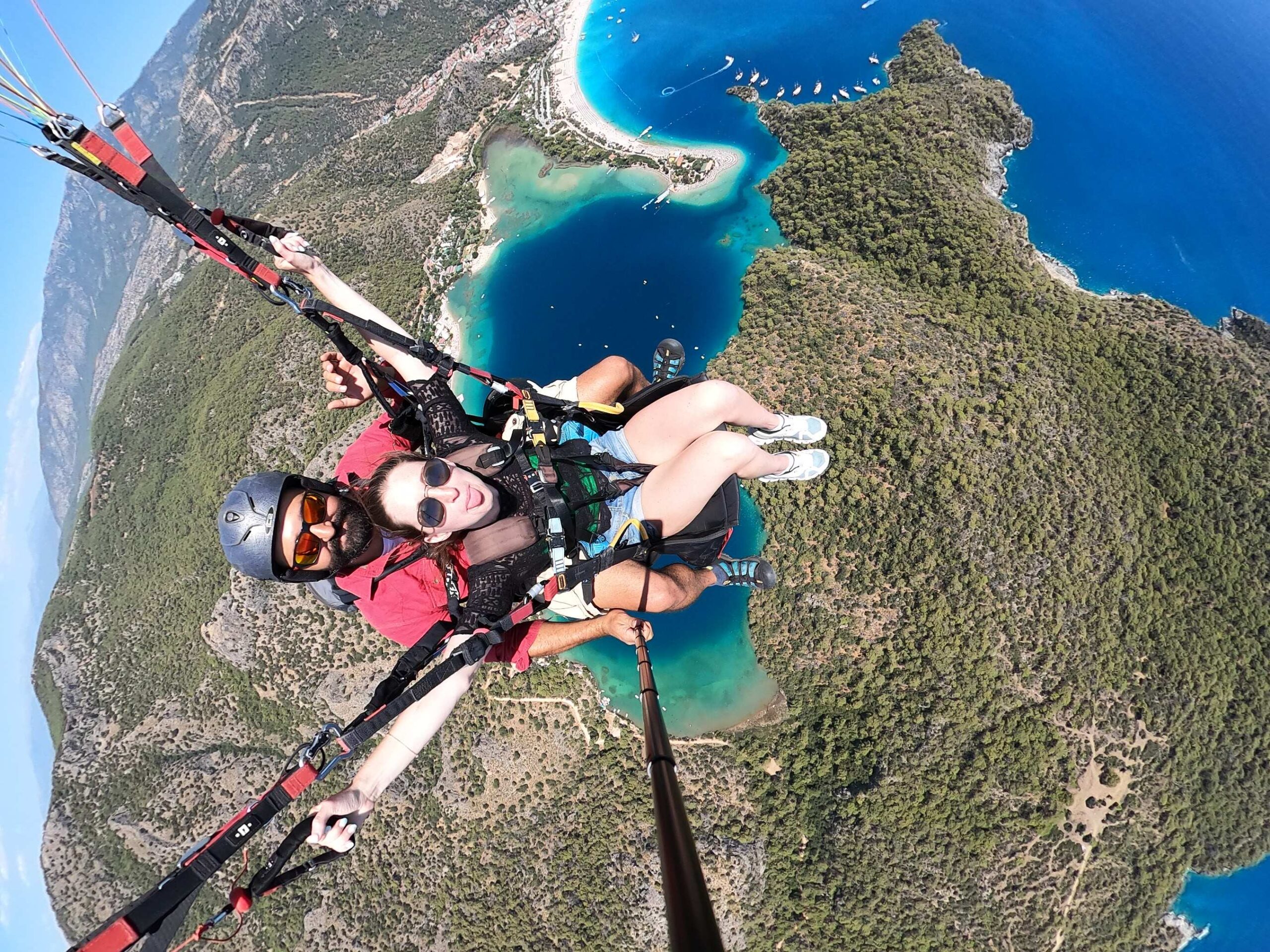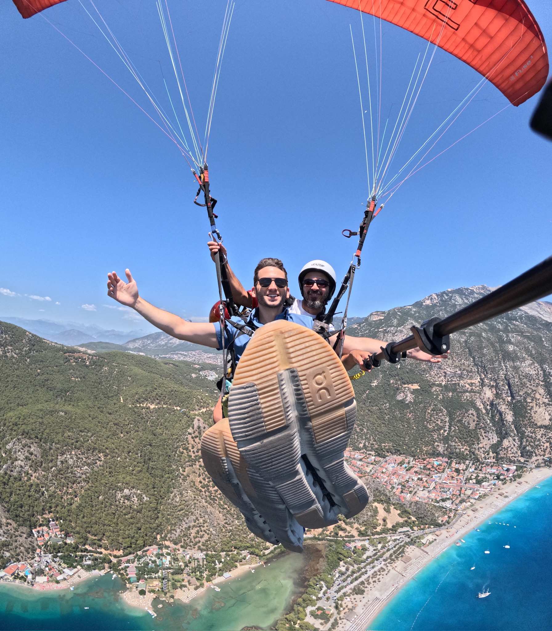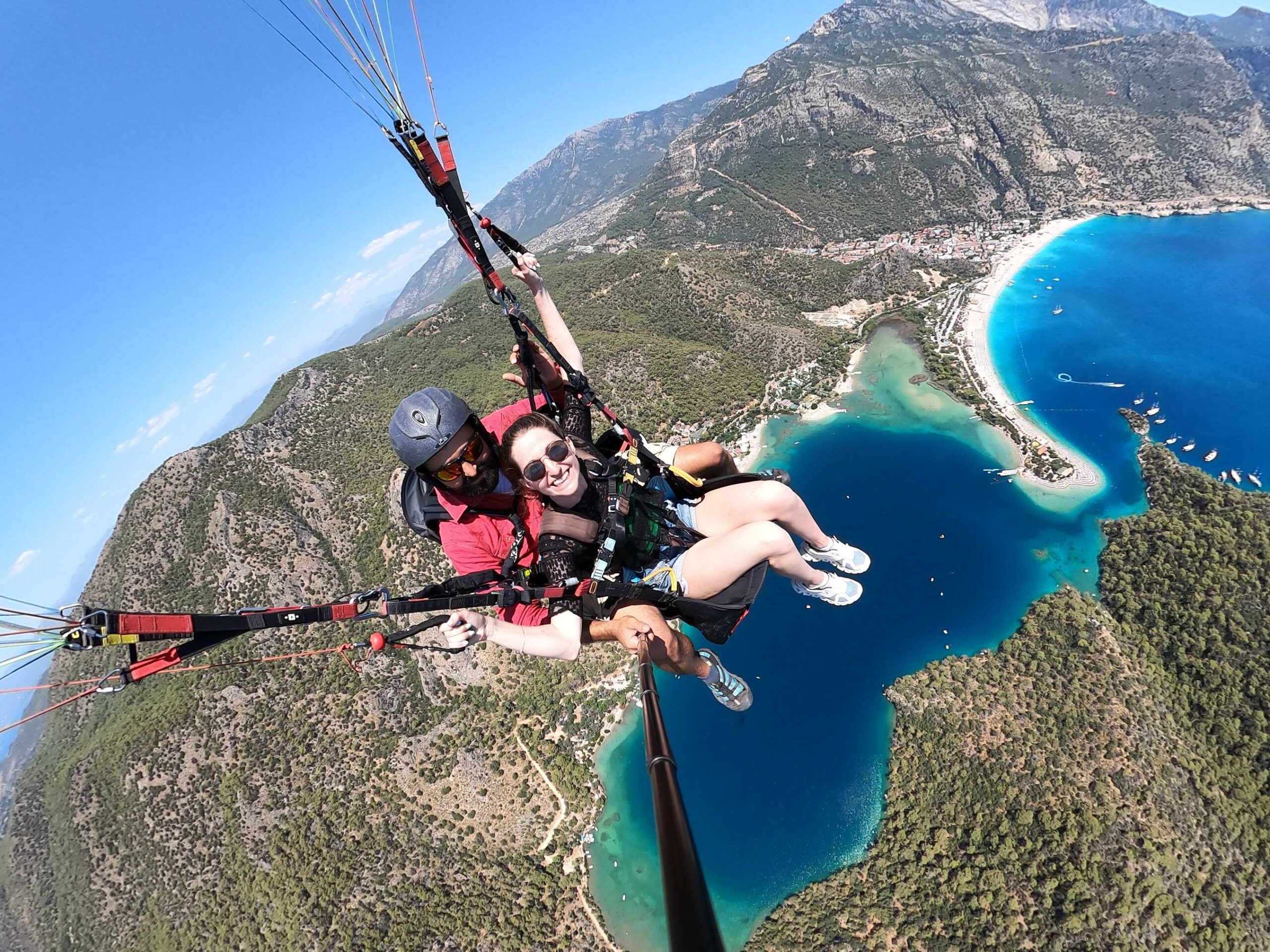 On day 2, my favorite day of the entire trip, we went to Ōlüdeniz Beach/blue lagoon. We started the day paragliding over the beach to get an aerial view. For my 21st, I went skydiving, so this seemed appropriate for my 35th- slightly less subdued, but still plenty of adrenaline. After a steep 30 minute drive up the mountain, I believe I was the first from our group to run down and leap off. Luckily I barely had time to process what I was doing. The long 25-30 minute flight was both frightening and deeply relaxing, a combination I hadn’t experienced before. My tandem instructor asked me if I wanted an extra burst of adrenaline, to which I obviously said yes. The speed at which he turned me around and then landed were by far the scariest part of the flight, but all.. still worth it. Because Evan’s tandem paraglider didn’t take off at the exact same time, poor Evan had to stand up and look at where he was going to run for the next 20 minutes, waiting for the wind to be “just right” to ensure the best conditions.