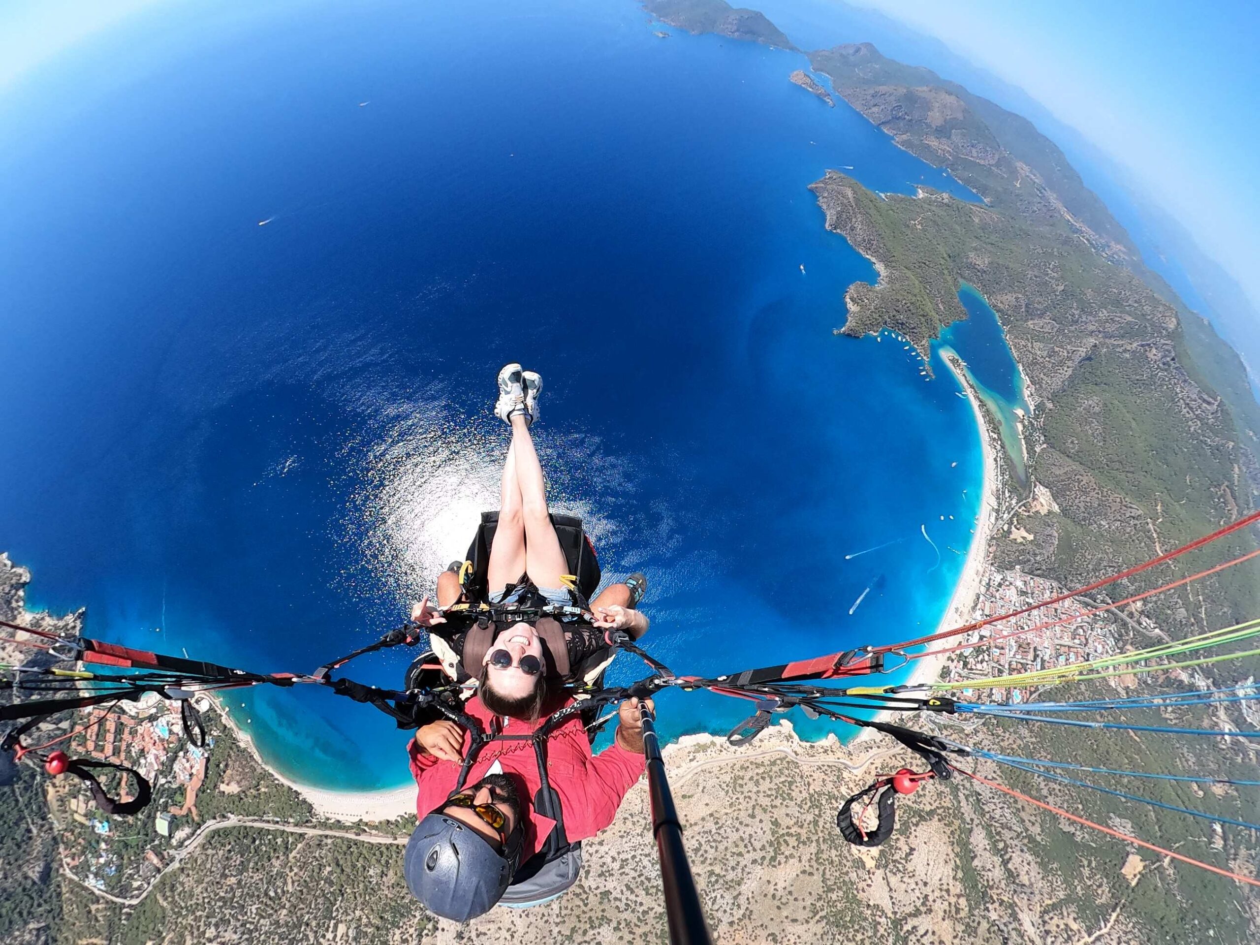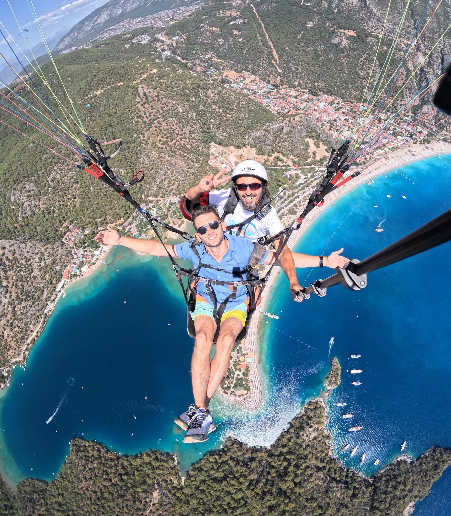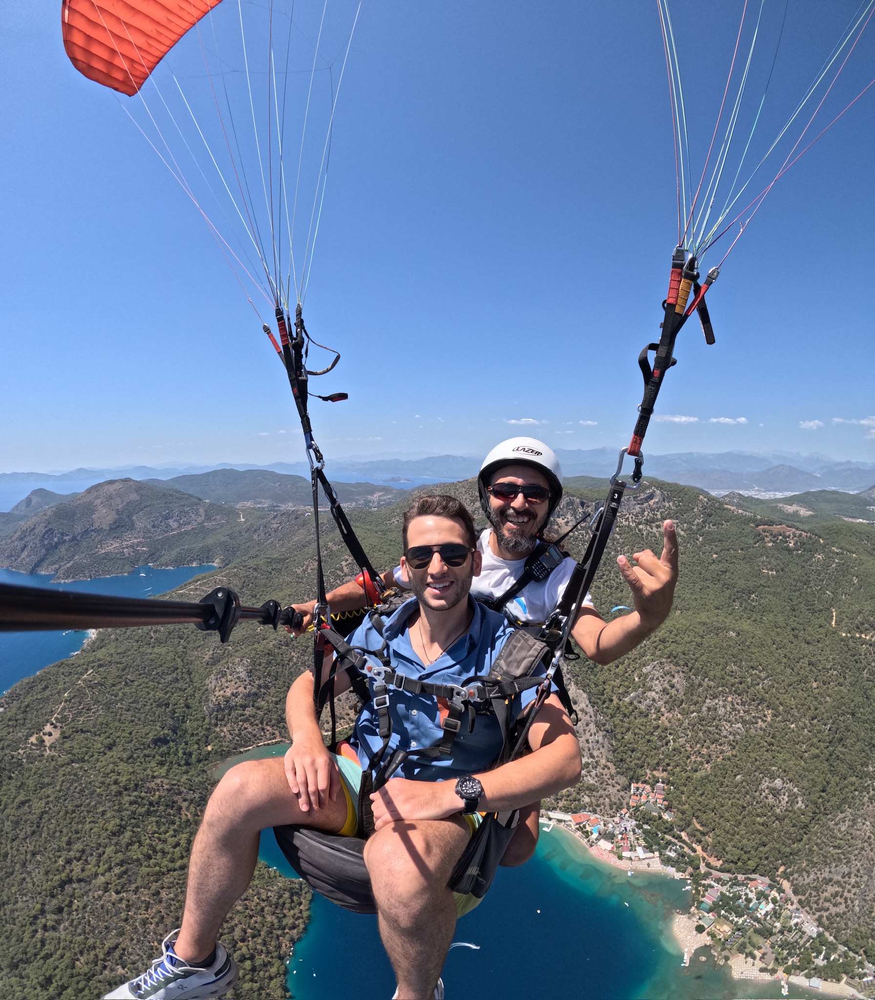 On day 2, my favorite day of the entire trip, we went to Ōlüdeniz Beach/blue lagoon. We started the day paragliding over the beach to get an aerial view. For my 21st, I went skydiving, so this seemed appropriate for my 35th- slightly less subdued, but still plenty of adrenaline. After a steep 30 minute drive up the mountain, I believe I was the first from our group to run down and leap off. Luckily I barely had time to process what I was doing. The long 25-30 minute flight was both frightening and deeply relaxing, a combination I hadn’t experienced before. My tandem instructor asked me if I wanted an extra burst of adrenaline, to which I obviously said yes. The speed at which he turned me around and then landed were by far the scariest part of the flight, but all.. still worth it. Because Evan’s tandem paraglider didn’t take off at the exact same time, poor Evan had to stand up and look at where he was going to run for the next 20 minutes, waiting for the wind to be “just right” to ensure the best conditions.